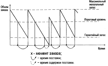 Гарантийный (страховой) запас позволяет обеспечивать потребность на время предполагаемой задержки поставки. При этом под возможной задержкой поставки подразумевается максимально возможная задержка. Восполнение гарантийного запаса производится в ходе последующих поставок через использование второго расчетного параметра данной системы — порогового уровня запаса.