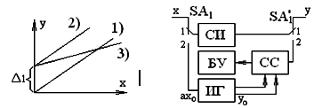 При данном способе коррекции уменьшение погрешностей осуществляется за счёт смещения функции преобразования СИ. ОП - обратный преобразователь (образцовый). Используется для выявления погрешностей. Операция выявления сигнала погрешности Δх происходит в результате одновременного или равномерного вычитания 2-х сигналов. Усиленный вспомогательным каналом ВК разностный сигнал у2 используется для введения поправки СИ. Пусть СИ имеет аддитивную и мультипликативную погрешность и его выходной сигнал у1=(а+Δ2)х+Δ1. А образцовый преобразователь имеет идеальную передаточную характеристику вида:
