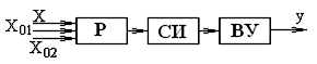 Для практической реализации способа необходимо иметь избыточность по быстродействию и набор образцовых сигналов. Где Р - включ. поочерёдно к входу образцовых значений х, СИ - система измерения, ВУ - вычислительное устройство. В случае линейного СИ можно записать для: