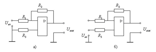 По способу включения операционные усилители подразделяются на инвертирующие и неинвертирующие.