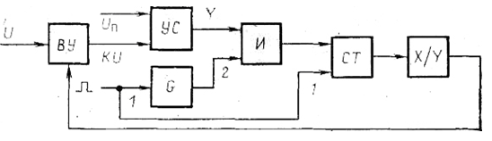 На вход УС поступают напряжение KU, где К – коэффициент преобразования ВУ (усиление или деление), и пороговое напряжение Uп, которое выбирается равным минимальному значению U, на основном диапазоне (K=1), при котором происходит переход на предшествующий диапазон. При KU< Uп на выходе УС образуется сигнал Y=1, при KU>Uп — сигнал Y=0. Поиск диапазона начинается с приходом импульса сигнала 1, устанавливающего счетчик импульсов СТ в исходное «0» состояние и запускающего генератор импульсов G. Код на выходе счетчика через преобразователь кода X/Y управляет реле, входящих в ВУ. В исходном нулевом состоянии включается старший диапазон. Если при этом KU>Uп, то элемент И будет закрыт для прохождения импульсов сигнала 2 от генератора на счетчик и останется включенным старший диапазон. Если же, KU< Uп, то элемент И пропустит 1-й импульс на счетчик в результате чего включится следующий диапазон, и т. д. Поскольку количество диапазонов невелико (4-10), СТ содержит всего 2-3 разряда.