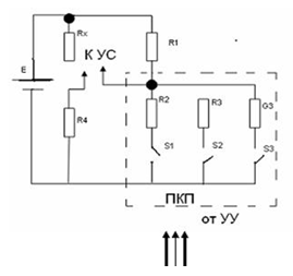 Измеряемой величиной является сопротивление Rx.Название мост широкого диапазона обусловлено тем, что этот диапазон распространяется от нуля до какого-то максимального значения. Противоположное плечо представляет набор резисторов с ключами S1, S2, S3, управляемые кодом от УУ. Каждому значению Rx соответствует определенная комбинация замкнутых ключей, при которой мост уравновешивается, т.е. выполняется условие равновесия Rx*R3=R2*R4