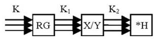 В регистр поступает код К и хранится в нём как код К1. Этот код посредством преобразователя X/Y преобразуется в код К2, необходимый для управления ЦИ (*Н).