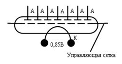 Катоды выполняются из нихрома в виде цифр. Анод – проволочная сетка вокруг катодов. Напряжение между анодом и катодом составляет 150 .. 200 В, ток – 2.5 мА.