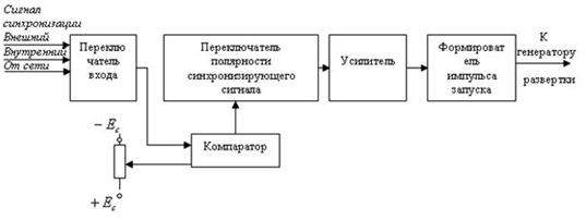 С помощью переключателя входа выбирается синхронизирующий сигнал, компаратор определяет момент запуска развертки. Сигнал с усилителя поступает на формирователь импульсов, формирующий запускающий сигнал с крутым передним фронтом, независимо от параметров входного сигнала.