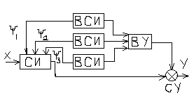 СИ – средство измерения; ВСИ - вспомогательное средство измерения; ВУ - вычислительное устройство; y – выходной сигнал; кружок с крестиком – суммирующее устройство; Ψ – влияющие факторы.