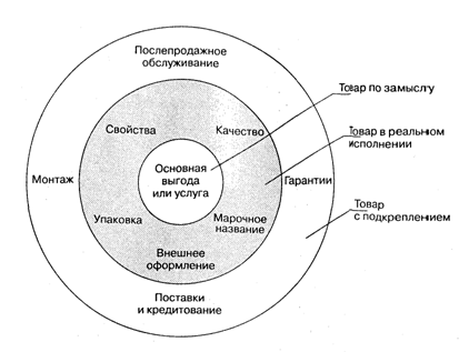 Ф.Котлер в своей модели товара выделяет основную выгоду, предлагаемую товаром для удовлетворения базовой потребности, а также совокупность коммерческих характеристик , которые важны для адаптации товара у имеющимся у потребителя второстепенным потребностям. В зависимости от этого в модели выделено три уровня товара: