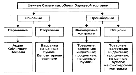 В зависимости от особенностей обращения отдельных финансовых инструментов на рынке ценных бумаг выделяются рыночные и нерыночные ценные бумаги. Первые свободно продаются и покупаются в рамках биржевого или внебиржевого оборота и не могут быть предъявлены эмитенту досрочно. Вторые, наоборот, не имеют вторичного обращения (т. е. хождения на бирже и за ее пределами), но могут быть возвращены эмитенту досрочно, например, целый ряд государственных и нерыночных обязательств, акции трудовых коллективов. На фондовых биржах объектом торговли служат многообразные ценные бумаги, которые можно классифицировать по признаку распространения имущественных прав: на актив, лежащий в основе ценной бумаги, или на изменение его цены.