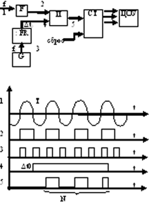 С формирователя F сигнал прямоугольной формы поступает на один из входов И, на другой вход поступает импульс длительности Δt0, который получается на выходе делителя частоты :FR и делится в К раз. Счетчик СТ подсчитывает число переходов от 0 к 1 на интервале Δt0. Код числа N поступает на ЦОУ. Без учета погрешности можно записать, что количество импульсов N,поступивших на счетчик: