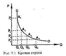 Спрос всех групп покупателей на данное благо есть рыночный спрос. Рыночный спрос, в первую очередь зависит от цены: D = f(p). Величина спроса на некий товар - это количество товаров, которое покупатели желают приобрести за некоторый период времени по определенной цене. Цена и величина спроса находятся в обратном соотношении: чем выше цена, тем меньше, при прочих равных условиях, величина спроса. Обратная зависимость между ценой и величиной спроса на товар или услугу в течение определенного периода времени называется законом спроса. Графически он изображается в виде кривой спроса.