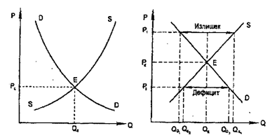 В точке Е при равновесной цене (Pe) спрос и предложение взаимоуравновешиваются (Qs=Qd). Ры¬нок сбалансирован. Покупатели и продавцы отстаивают свои интересы.