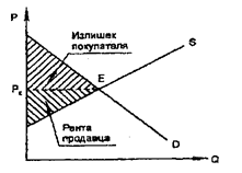 От снижения цены на каждую последующую единицу товара выигрывает покупатель – потребительский излишек - разница между ценой, которую потребитель готов заплатить за товар, и той, более низкой ценой (равновесной), которую он действительно платит при покупке. Продавцы, у которых индивидуальные издержки ниже предельных рыночных (ниже цен равновесия), получают дополнительный доход (дополнительный выигрыш), - рента продавца - это разница между ценой, по которой производитель готов поставить товар, и более высокой (равновесной) ценой, по которой он его продает.