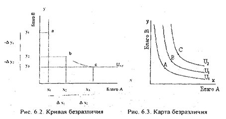 Отрезок кривой, соединяющий точки «а» и «с» показывает зону безразличия, т.е. совокупность потребительских наборов, которые обеспечивают одинаковый уровень удовлетворения потребностей, при условии, что величина потребительских благ А и В больше 0. Комбинация благ, обладающая большей или меньшей полезностью, будет находиться выше или ниже данной кривой безразличия. U1, U2 отличаются от Uo тем, что представляют наборы, характеризующиеся большим количеством благ X и У.