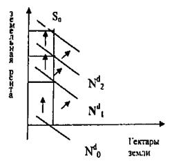 Исходя из того, что земля есть фиксированный природный ресурс и, предполагая ее однокачественность, мы можем сказать, что земельная рента не является фактором, стимулирующим увеличение предложения ресурса (в сравнении с заработной платой или ставкой процентов). Поэтому увеличение спроса на землю как на ресурс увеличит ренту и цену продукции (с/х, добывающей промышленности), но не увеличит предложение земли. Увеличение спроса на землю (Nd1.Nd2,Nd3) при фиксированном предложении земли (Sn) увеличит земельную ренту и цену продукции, но не предложение земли. Если спрос на землю меньше ее предложения (Nd0), то земельная рента будет = 0.
